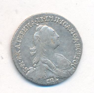Лицевая сторона — портрет императрицы и надпись «Б М ЕКАТЕРИНА II IМП I САМОД ВСЕРОС», оборотная — обозначение номинала (гривенникъ) и дата. Проба — 750, нормативный вес — 2,37 грамма, гурт — шнур.