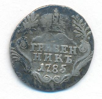 Выделяют два типа - «шея длиннее» и «шея короче». Лицевая сторона — портрет императрицы и надпись «Б М ЕКАТЕРИНА II IМП И САМОД ВСЕРОСС», оборотная — обозначение номинала (гривенникъ) и дата. Проба — 750, нормативный вес — 2,37 грамма, гурт — шнур.