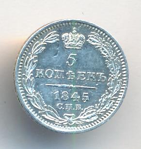 Лицевая сторона — новый гербовый орел с поднятыми крыльями, оборотная —обозначение номинала (5 копеекъ), окруженное венком из лавровой и дубовой ветвей и дата. Проба — 868, нормативный вес — 1,04 грамма.