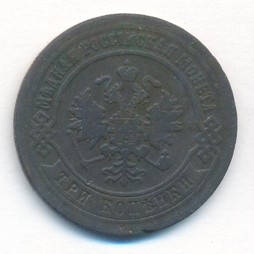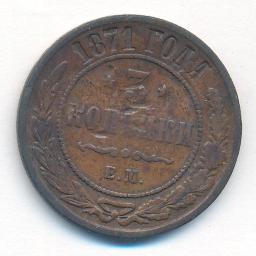Лицевая сторона — двуглавый орел, надпись МЕДНАЯ РОССIЙСКАЯ МОНЕТА и обозначение номинала (три копейки); оборотная — обозначение номинала (3 копейки) в бусовом ободке и дата. Нормативный вес — 9,83 грамма, гурт рубчатый.