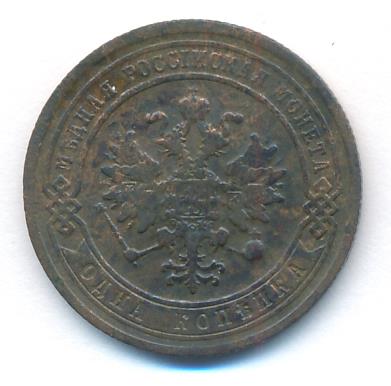 Лицевая сторона — двуглавый орел, надпись МЕДНАЯ РОССIЙСКАЯ МОНЕТА и обозначение номинала (одна копейка); оборотная — обозначение номинала (1 копейка) в бусовом ободке и дата. Нормативный вес — 3,28 грамма, гурт рубчатый.