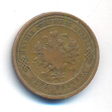 Лицевая сторона — двуглавый орел, надпись МЕДНАЯ РОССIЙСКАЯ МОНЕТА и обозначение номинала (одна копейка); оборотная — обозначение номинала (1 копейка) в бусовом ободке и дата. Нормативный вес — 3,28 грамма, гурт рубчатый.