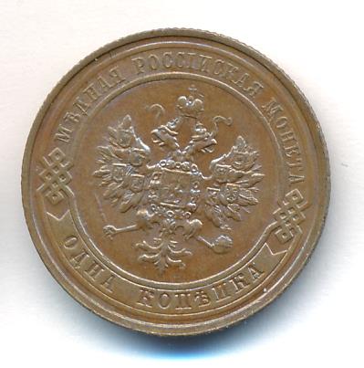 Лицевая сторона — двуглавый орел, надпись МЕДНАЯ РОССIЙСКАЯ МОНЕТА и обозначение номинала (одна копейка); оборотная — обозначение номинала (1 копейка) в бусовом ободке и дата. Нормативный вес — 3,28 грамма, гурт рубчатый.