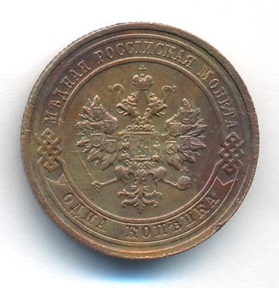 Лицевая сторона — двуглавый орел, надпись МЕДНАЯ РОССIЙСКАЯ МОНЕТА и обозначение номинала (одна копейка); оборотная — обозначение номинала (1 копейка) в бусовом ободке и дата. Нормативный вес — 3,28 грамма, гурт рубчатый.