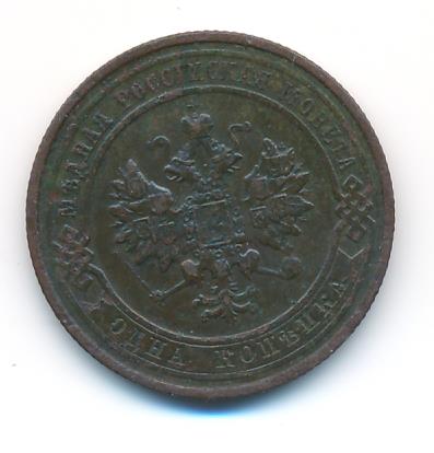 Лицевая сторона — двуглавый орел, надпись МЕДНАЯ РОССIЙСКАЯ МОНЕТА и обозначение номинала (одна копейка); оборотная — обозначение номинала (1 копейка) в бусовом ободке и дата. Нормативный вес — 3,28 грамма, гурт рубчатый.