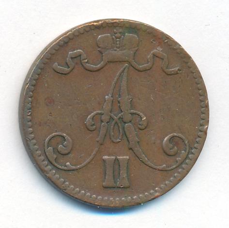 Лицевая сторона — вензель Александра II, оборотная — номинал (5 PENNIA) и дата. Нормативный вес — 6,40 грамма, гурт гладкий.