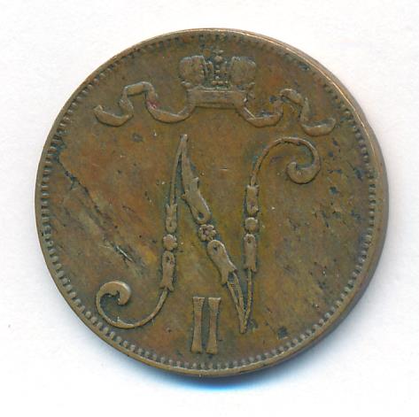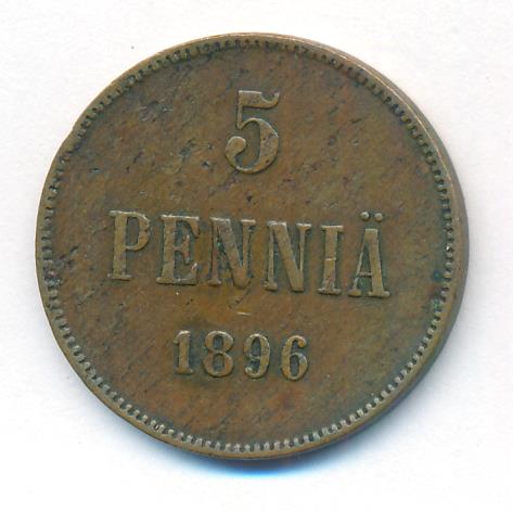 Лицевая сторона — вензель Александра II, оборотная — номинал (5 PENNIA) и дата. Нормативный вес — 6,40 грамма, гурт гладкий.