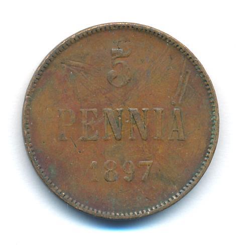Лицевая сторона — вензель Александра II, оборотная — номинал (5 PENNIA) и дата. Нормативный вес — 6,40 грамма, гурт гладкий.