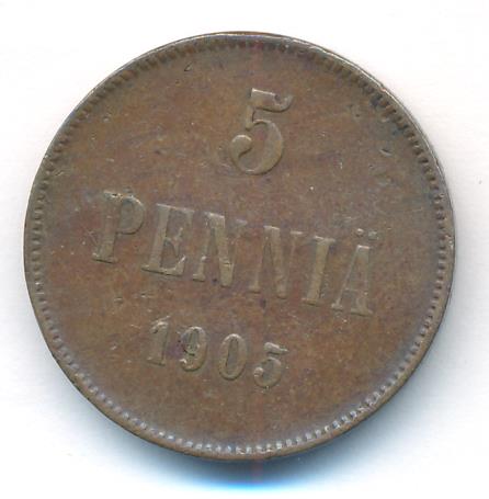 Лицевая сторона — вензель Александра II, оборотная — номинал (5 PENNIA) и дата. Нормативный вес — 6,40 грамма, гурт гладкий.