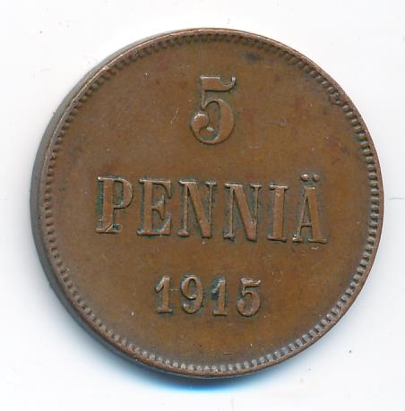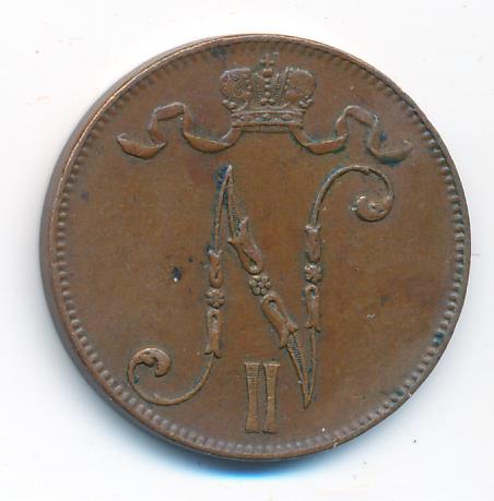 Лицевая сторона — вензель Александра II, оборотная — номинал (5 PENNIA) и дата. Нормативный вес — 6,40 грамма, гурт гладкий.