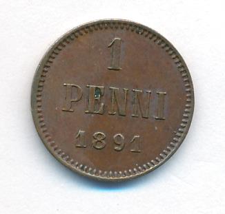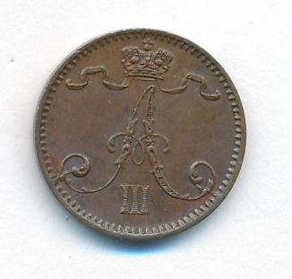 Лицевая сторона — вензель Александра II, оборотная — номинал (1 PENNIA) и дата. Нормативный вес — 1,28 грамма, гурт гладкий.