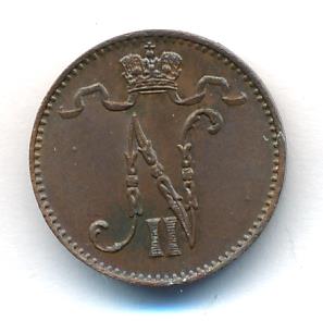 Лицевая сторона — вензель Александра II, оборотная — номинал (1 PENNIA) и дата. Нормативный вес — 1,28 грамма, гурт гладкий.