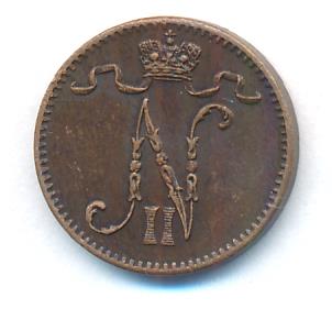 Лицевая сторона — вензель Александра II, оборотная — номинал (1 PENNIA) и дата. Нормативный вес — 1,28 грамма, гурт гладкий.