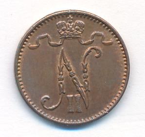 Лицевая сторона — вензель Александра II, оборотная — номинал (1 PENNIA) и дата. Нормативный вес — 1,28 грамма, гурт гладкий.