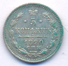 Лицевая сторона — гербовый орел, оборотная —обозначение номинала (5 копеекъ), окруженное венком из лавровой и дубовой ветвей и дата.