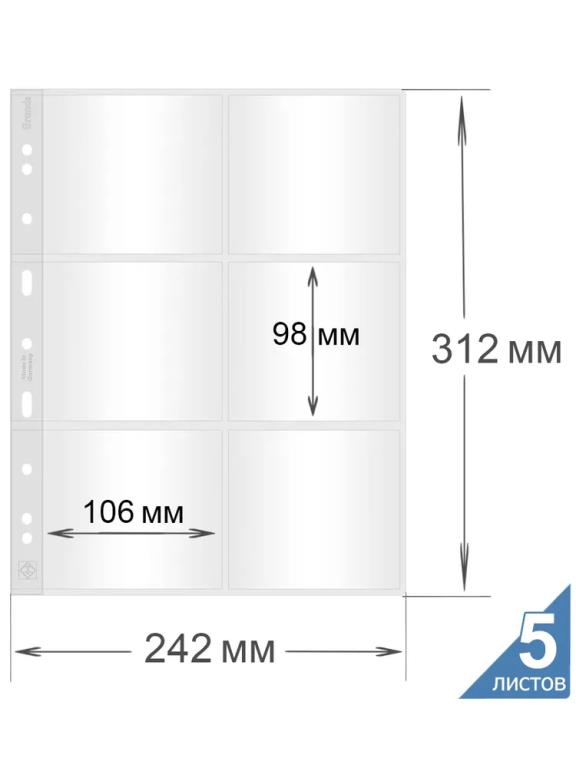 Особенности: Особенности: потернтости и замятия на листах. Размер листа 312х240 мм, размер ячейки 106х98 мм, материал: полиэстер. Коллекционный материал виден с обеих сторон. Лист системы GRANDE для банкнот из пленки повышенной прозрачности. Производство: импортное. Можно использовать для хранения подставок под пивные бокалы.