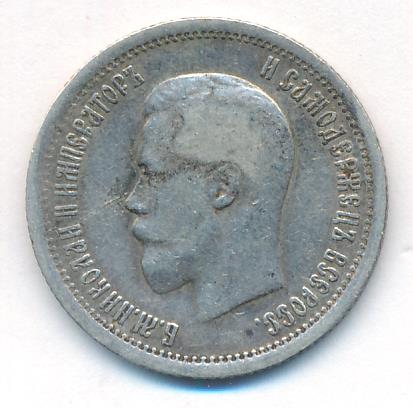 Лицевая сторона — портрет Николая II в круговой надписи «Б.М. НИКОЛАЙ II ИМПЕРАТОРЪ И САМОДЕРЖЕЦЪ ВСЕРОСС», оборотная — двуглавый орел, обозначение номинала (25 копеекъ) и дата.