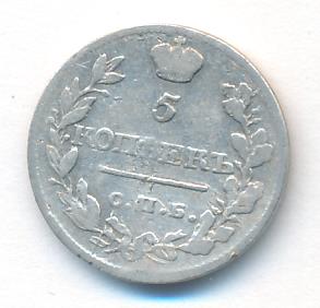Лицевая сторона - двуглавый орел и дата, оборотная — обозначение номинала (5 копеекъ) в венке из лавровой и дубовой ветвей. Проба до 1813 года — 750, нормативный вес — 1,2 грамма; после 1813 года — проба 868, нормативный вес — 1,04 грамма.