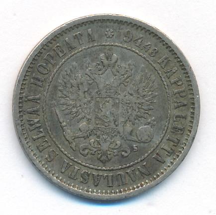 Лицевая сторона — российский двуглавый орел с гербом Великого княжества Финляндского на груди в кольцевой надписи с указанием количества штук (94,48) из фунта сплава серебра, оборотная — номинал и дата в венке из дубовых листьев. Проба — 868, нормативный вес — 5,18 грамма, гурт рубчатый.