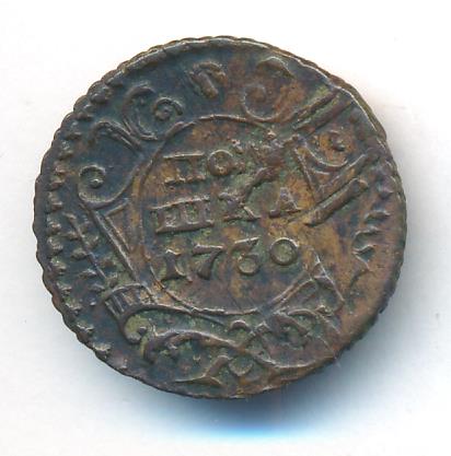 С 1730 года, как и 30 лет назад, медь возвращает себе статус разменных долей серебряной копейки — печатаются только денги и полушки. Указ от 22 декабря 1730 года регламентирует их выпуск на 10 рублей из пуда меди. Петровские копейки 20-рублевой стопы перечеканиваются в денги, а копейки Петра II 40-рублевой стопы — в полушки.