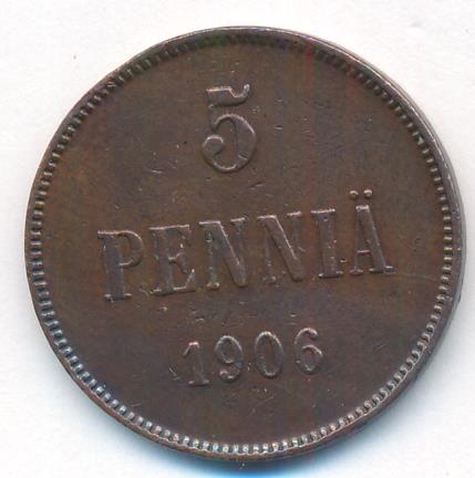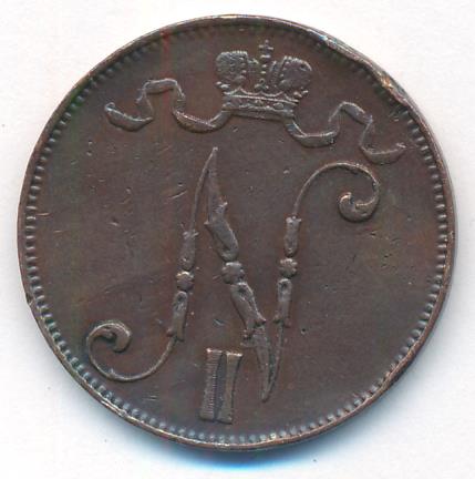 Лицевая сторона — вензель Александра II, оборотная — номинал (5 PENNIA) и дата. Нормативный вес — 6,40 грамма, гурт гладкий.