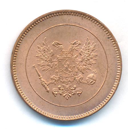 Лицевая сторона — вензель Александра II, оборотная — номинал (5 PENNIA) и дата. Нормативный вес — 6,40 грамма, гурт гладкий.