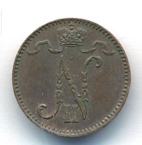 Лицевая сторона — вензель Александра II, оборотная — номинал (1 PENNIA) и дата. Нормативный вес — 1,28 грамма, гурт гладкий.