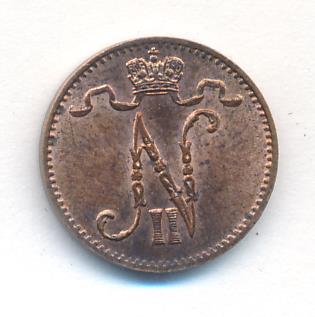 Лицевая сторона — вензель Александра II, оборотная — номинал (1 PENNIA) и дата. Нормативный вес — 1,28 грамма, гурт гладкий.