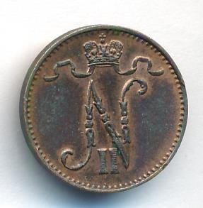 Лицевая сторона — вензель Александра II, оборотная — номинал (1 PENNIA) и дата. Нормативный вес — 1,28 грамма, гурт гладкий.