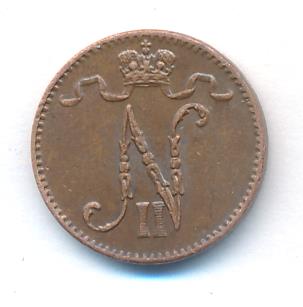 Лицевая сторона — вензель Александра II, оборотная — номинал (1 PENNIA) и дата. Нормативный вес — 1,28 грамма, гурт гладкий.