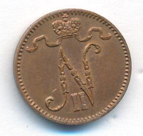 Лицевая сторона — вензель Александра II, оборотная — номинал (1 PENNIA) и дата. Нормативный вес — 1,28 грамма, гурт гладкий.