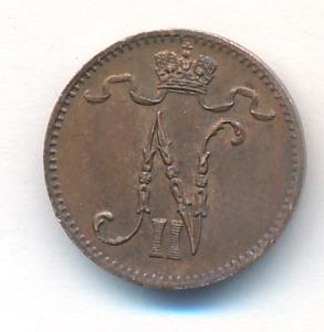 Лицевая сторона — вензель Александра II, оборотная — номинал (1 PENNIA) и дата. Нормативный вес — 1,28 грамма, гурт гладкий.