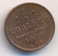Лицевая сторона — вензель Александра II в венке из лавровой и дубовой ветвей; оборотная — обозначение номинала (1/4 копейки) и дата. Нормативный вес — 0,82 грамма, гурт рубчатый.