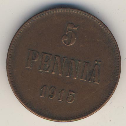 Лицевая сторона — вензель Александра II, оборотная — номинал (5 PENNIA) и дата. Нормативный вес — 6,40 грамма, гурт гладкий.