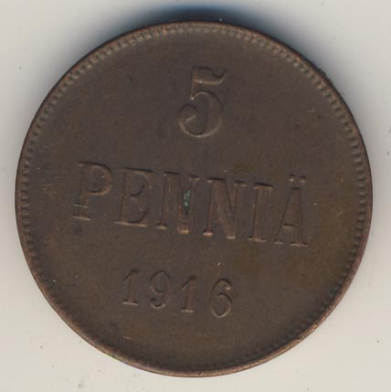 Лицевая сторона — вензель Александра II, оборотная — номинал (5 PENNIA) и дата. Нормативный вес — 6,40 грамма, гурт гладкий.