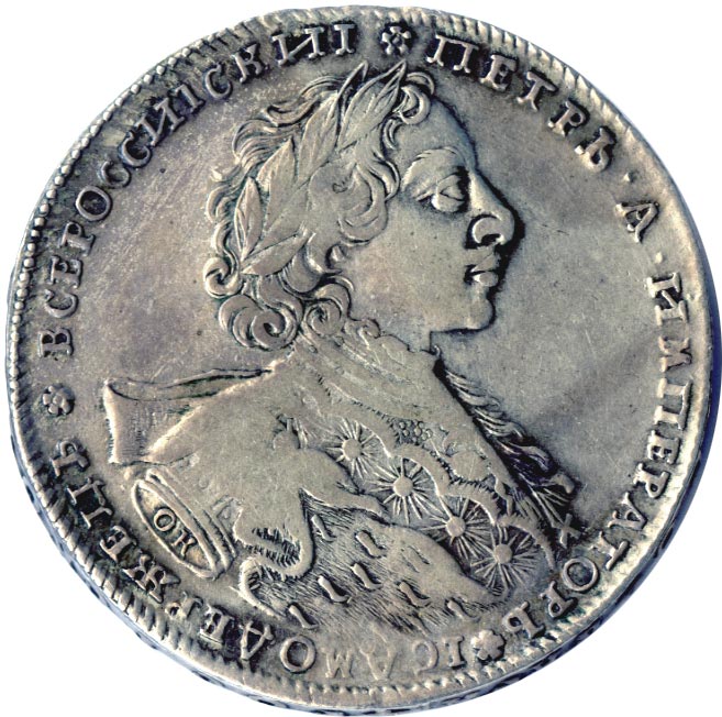 В 1723 году портрет на рублевых монетах меняется, причем дважды. Первый вариант — у нумизматов он получил прозвище «тигровик» - примечателен тем, что на нем латы царя прикрыты горностаевой мантией, а на груди — знаки ордена Св. Андрея Первозванного. В обрезе рукава вновь появляется знак ОК. Выделяют четыре типа лицевой стороны по наличию и размеру андреевского креста на груди.