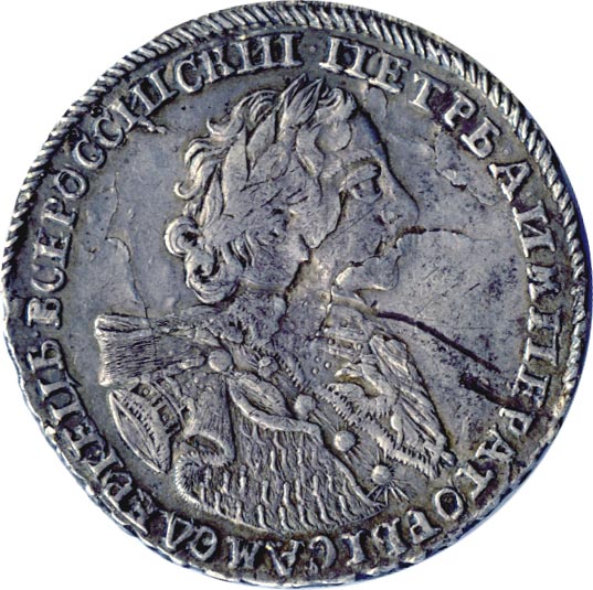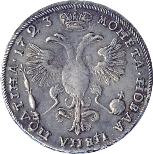 В 1723 году на портретных монетах меняется облик императора: латы на его груди теперь прикрыты горностаевой мантией, на груди — знаки ордена Св. Андрея Первозванного. Рубли и полтины этого типа, получившие у нумизматов название «тигровые», печатает только Кадашевский двор. Деятельность Красного по-прежнему заморожена, а Петербургский двор начнет работать только в 1724 году.