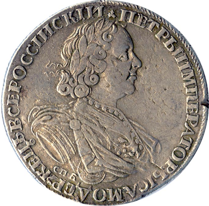 Легенда лицевой стороны - «Петр I Император и Самодержец Всероссийский», оборотной - «Монета новая цена рубль» и дата арабскими цифрами. Проба — 729, вес 28, 44 грамма, гурт - шнур.