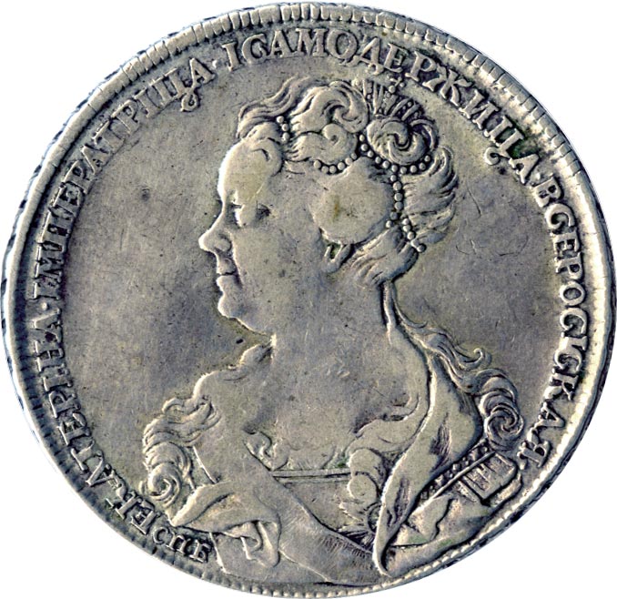 Гурт на монетах Кадашевского двора - «россискоi рубль ея i в (императорского величества) московского двора», гурт на петербургских монетах — узор или шнур. Легенда лицевой стороны - «Екатерина императрица и самодержица всероссийская», оборотной - «Монета новая цена рубль» и дата арабскими цифрами. Проба -729, нормативный вес — 28,44 грамма.