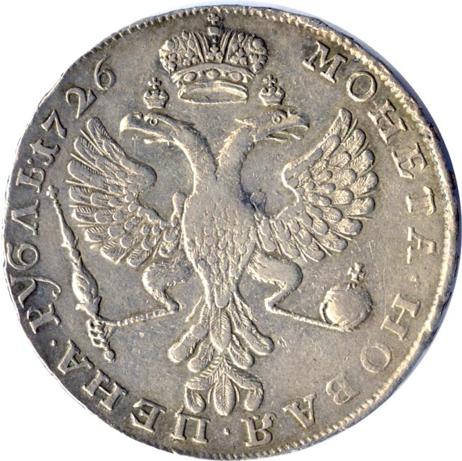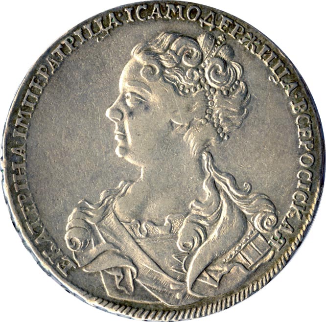 Гурт на монетах Кадашевского двора - «россискоi рубль ея i в (императорского величества) московского двора», гурт на петербургских монетах — узор или шнур. Легенда лицевой стороны - «Екатерина императрица и самодержица всероссийская», оборотной - «Монета новая цена рубль» и дата арабскими цифрами. Проба -729, нормативный вес — 28,44 грамма.