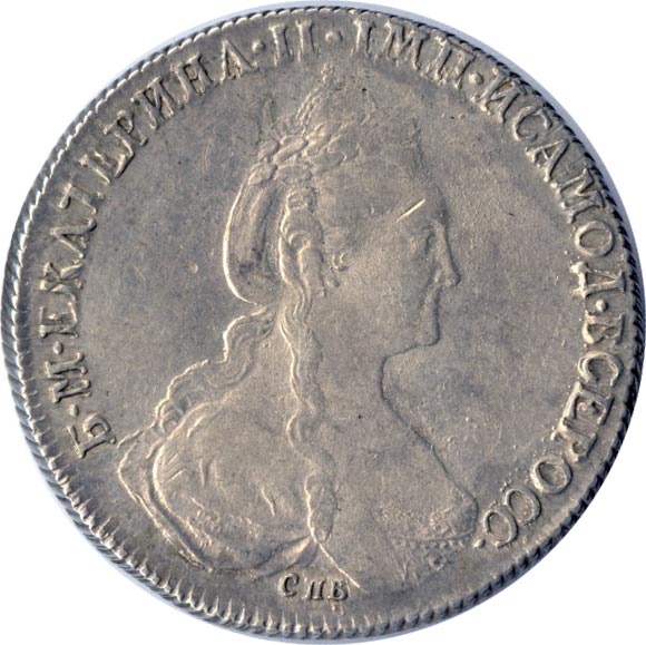 Выделяют два типа - «шея длиннее» и «шея короче». Лицевая сторона — портрет императрицы и надпись «Б М ЕКАТЕРИНА II IМП И САМОД ВСЕРОСС», оборотная — двуглавый орел и надпись «МОНЕТА РУБЛЬ» и дата. Проба — 750, нормативный вес — 24 грамма, гурт — шнур.