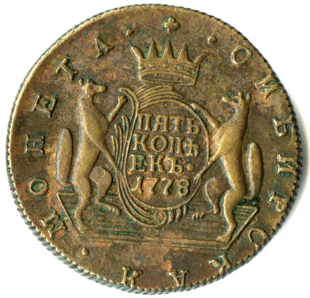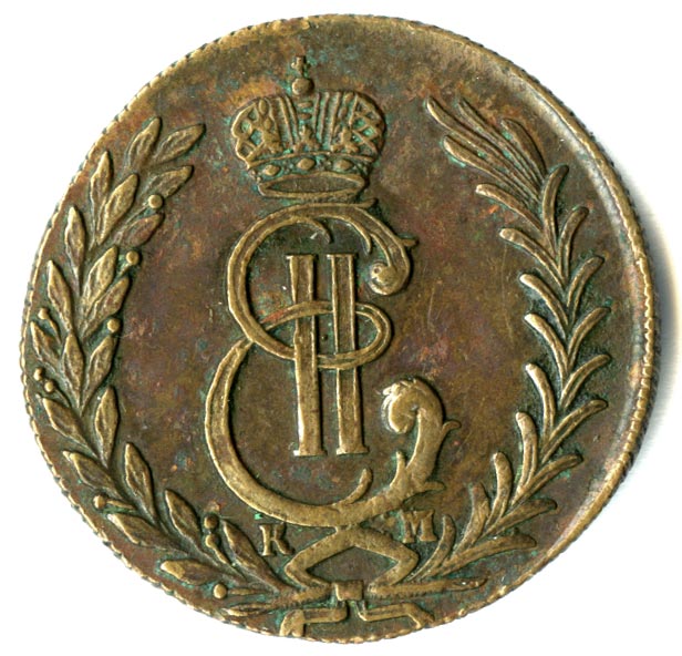 Лицевая сторона - два соболя поддерживают щит с обозначением номинала (пять копеекъ) под короной, надпись «СИБИРСКАЯ МОНЕТА». Оборотная — вензель Екатерины II в венке из пальмовой и лавровой ветвей. Гурт — надпись «колыванская медь» или шнур. Вес — 32,76 грамма.