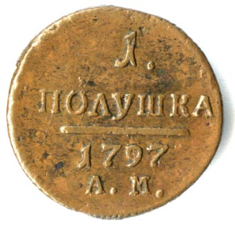 Лицевая сторона — вензель Павла I под короной, оборотная — номинал (1 полушка) и дата. Нормативный вес — 2,56 грамма, гурт — шнур.