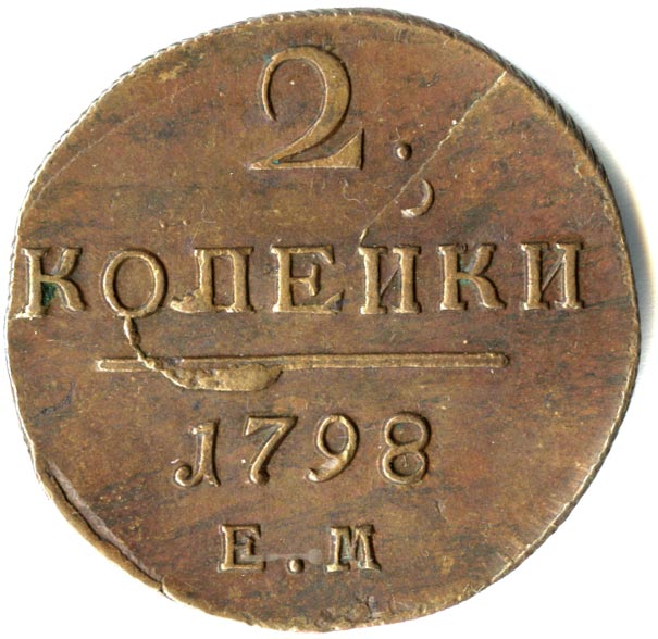 Правительство Павла манифестом от 20 января 1797 года отменяет проект Платона Зубова (удвоение номиналов медных монет по 32-рублевой стопе) и начинает массовую обратную перечеканку легких 10-копеечников и 4-копеечников.