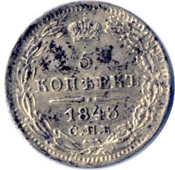 Лицевая сторона — новый гербовый орел с поднятыми крыльями, оборотная —обозначение номинала (5 копеекъ), окруженное венком из лавровой и дубовой ветвей и дата. Проба — 868, нормативный вес — 1,04 грамма.