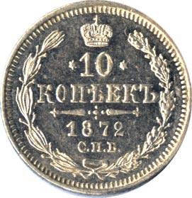 Лицевая сторона — гербовый орел, оборотная —обозначение номинала (10 копеекъ), окруженное венком из лавровой и дубовой ветвей и дата.
