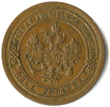 Лицевая сторона — двуглавый орел, надпись МЕДНАЯ РОССIЙСКАЯ МОНЕТА и обозначение номинала (одна копейка); оборотная — обозначение номинала (1 копейка) в бусовом ободке и дата. Нормативный вес — 3,28 грамма, гурт рубчатый.