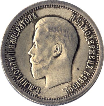 Николай II сохраняет принятый отцом тип, но на банковских монетах его портрет (работы Васютинского) повернут влево (на запад). На оборотной стороне сохраняется тот же герб, вплоть до знака АГ под задней ногой коня.