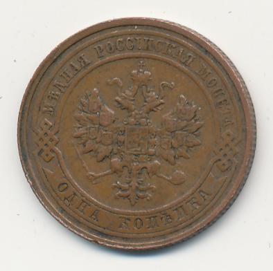 Лицевая сторона — двуглавый орел, надпись МЕДНАЯ РОССIЙСКАЯ МОНЕТА и обозначение номинала (одна копейка); оборотная — обозначение номинала (1 копейка) в бусовом ободке и дата. Нормативный вес — 3,28 грамма, гурт рубчатый.