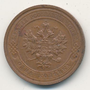 Лицевая сторона — двуглавый орел, надпись МЕДНАЯ РОССIЙСКАЯ МОНЕТА и обозначение номинала (одна копейка); оборотная — обозначение номинала (1 копейка) в бусовом ободке и дата. Нормативный вес — 3,28 грамма, гурт рубчатый.